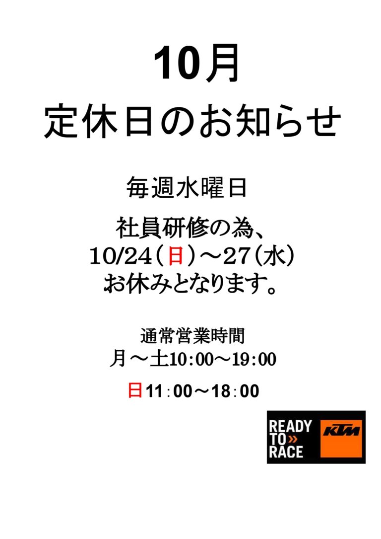 日頃よりKTM沖縄をご利用いただきありがとうございます。 今月の休業日のご連絡させて頂きます。 -